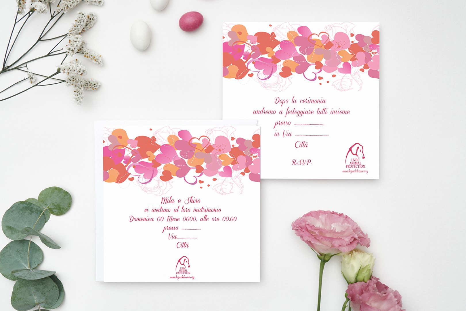 Cartoncino partecipazione + cartoncino invito, formato 15 x 15 cm, stampa solo fronte.