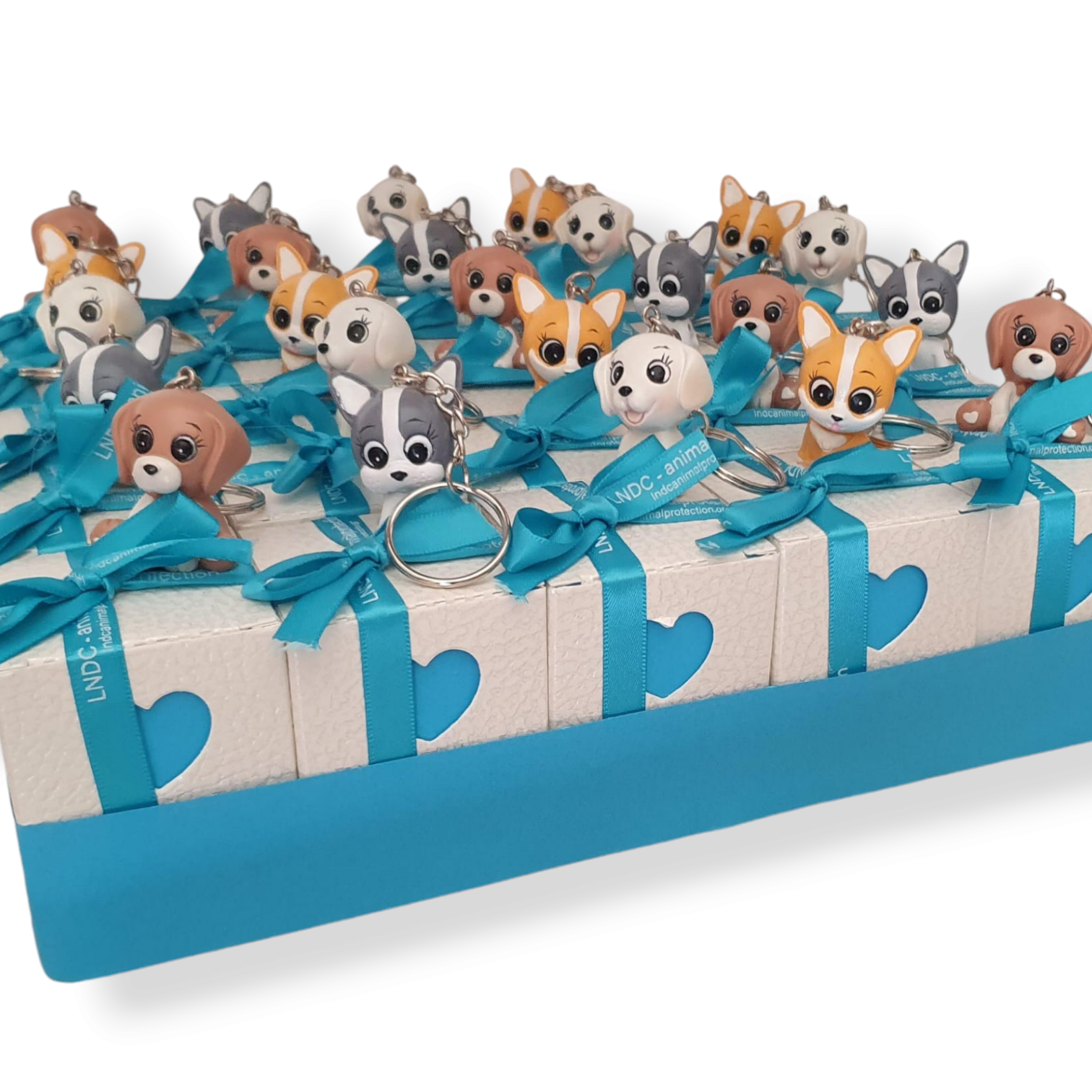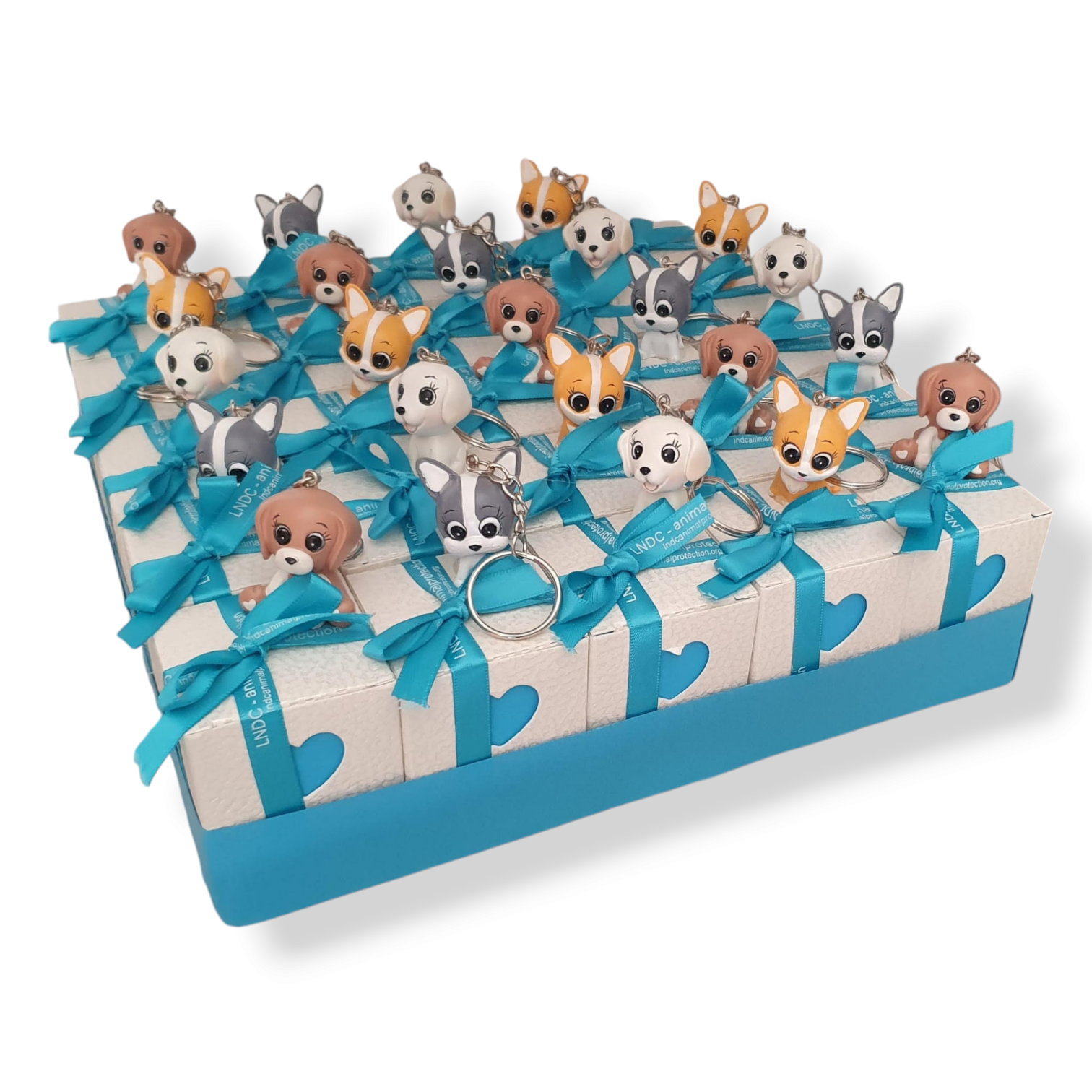 Vassoio azzurro o rosa cm. 27x27x7h. con 25 astucci panna di cm.5x5x5 decorati con portachiavi a forma di cane.