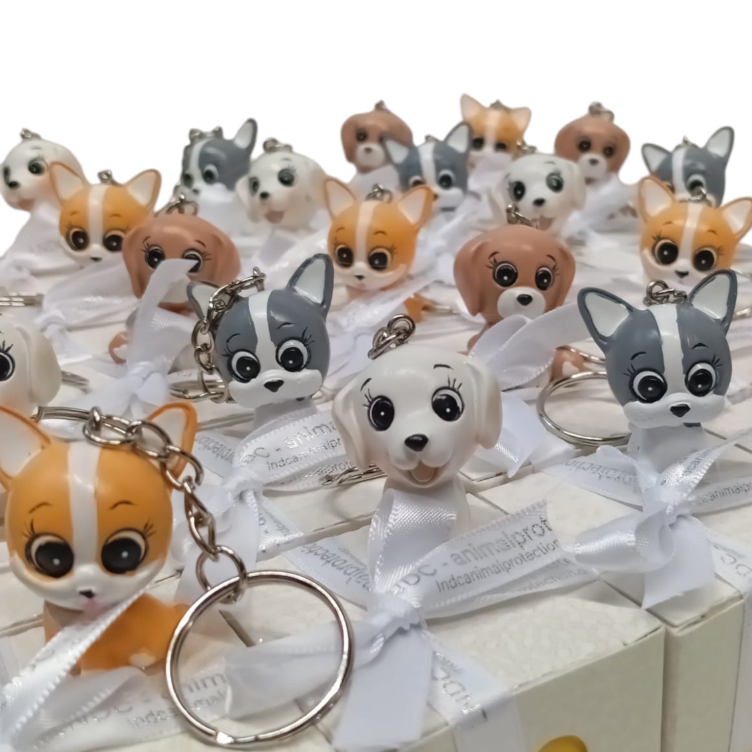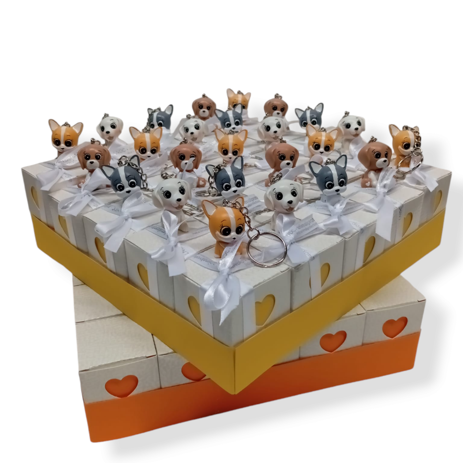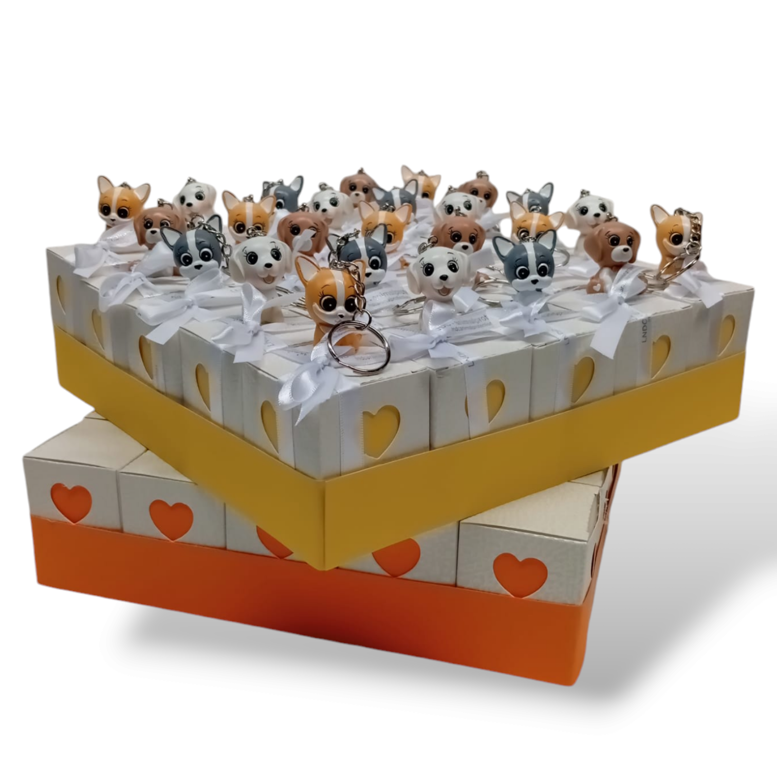 Vassoio arancione o giallo cm. 27x27x7h. con 25 astucci panna di cm.5x5x5 decorati con portachiavi a forma di cane.